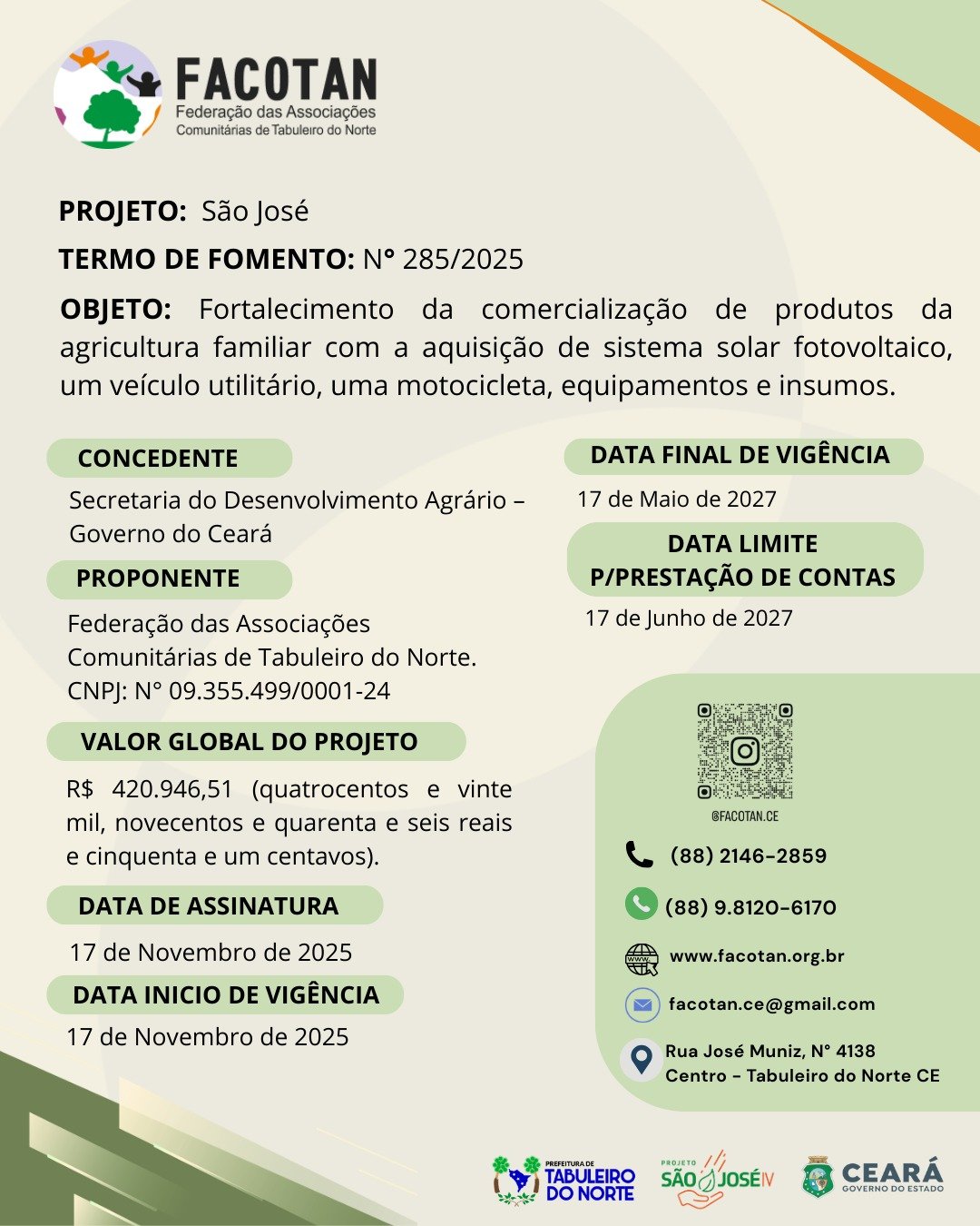 - Início do Projeto São JoséProjeto em Execução: Fortalecimento da Agricultura Familiar A Federação das Associações Comunitárias de Tabuleiro do Norte (Facotan) tem a satisfação de anunciar a execução do projeto Fortalecimento da Agricultura Familiar Financiado pelo Projeto São José. Este projeto é fruto do Termo de Fomento nº 285/2025, celebrado com o Estado do Ceara, por… Leia mais: Início do Projeto São José