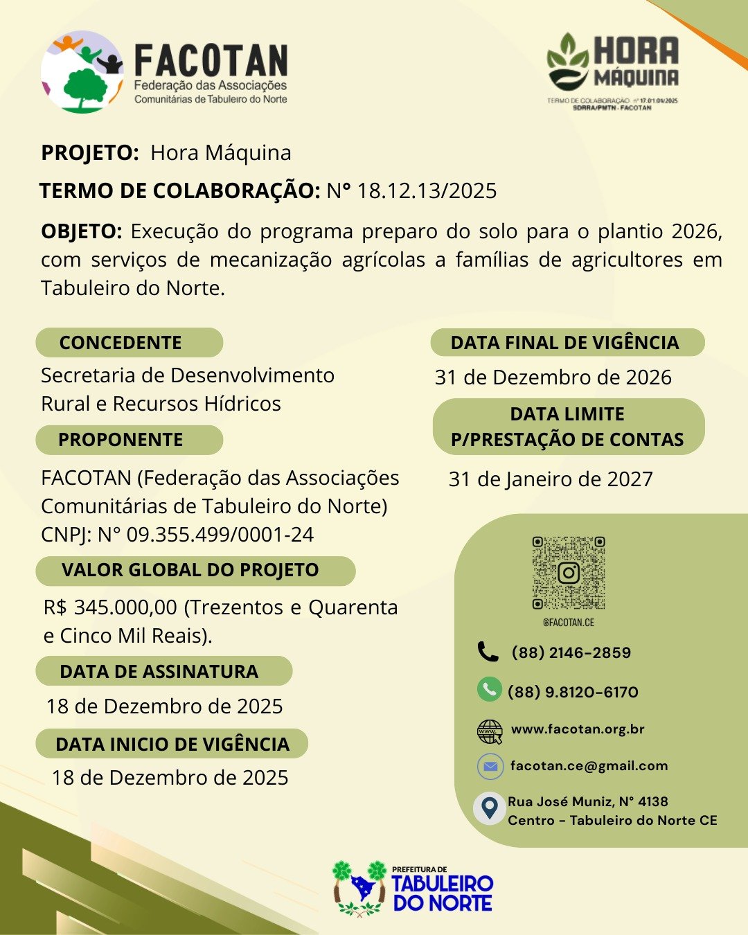 - Projeto Hora MáquinaProjeto em Execução: Preparo do Solo para o Plantio 2026 A Federação das Associações Comunitárias de Tabuleiro do Norte (Facotan) tem a satisfação de anunciar a execução do projeto Preparo do Solo para o Plantio 2026. Este projeto é fruto do Termo de Colaboração nº 18.12.13/2025, celebrado com o Município de Tabuleiro… Leia mais: Projeto Hora Máquina
