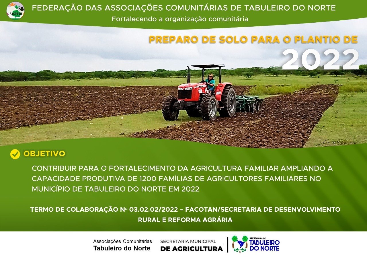 O Programa Preparo do Solo para Plantio 2022 – “Projeto Hora Máquina” constitui uma ação institucional executada pela FACOTAN em regime de mútua cooperação com o Município de Tabuleiro do Norte. A parceria fundamenta-se no interesse público e na promoção do desenvolvimento rural sustentável.